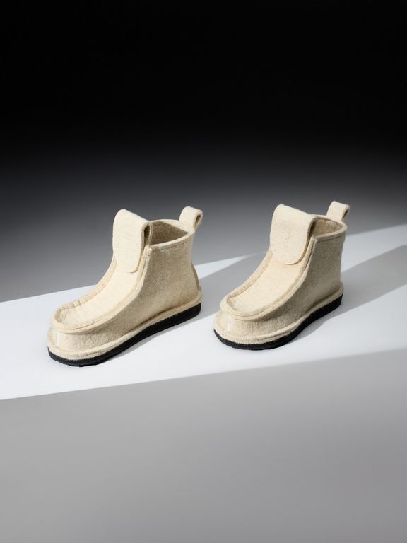 Валеши короткие белого цвета - повседневная зимняя обувь, изготовлена из войлока (100% натуральная овечья шерсть) на подошве из ЭВА (вспененный каучук). Модель имеет дополнительную вкладную стельку из войлока. Валеши предназначены для носки в холодных помещениях, а также при ведении домашнего хозяйства.