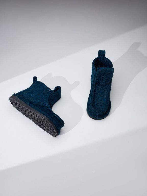 Валеши короткие синего цвета - повседневная зимняя обувь, изготовлена из войлока (100% натуральная овечья шерсть) на подошве из ЭВА (вспененный каучук). Модель имеет дополнительную вкладную стельку из войлока. Валеши предназначены для носки в холодных помещениях, а также при ведении домашнего хозяйства.
