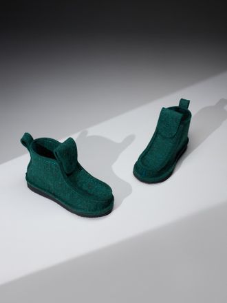 Валеши короткие зеленого цвета - повседневная зимняя обувь, изготовлена из войлока (100% натуральная овечья шерсть) на подошве из ЭВА (вспененный каучук). Модель имеет дополнительную вкладную стельку из войлока. Валеши предназначены для носки в холодных помещениях, а также при ведении домашнего хозяйства.